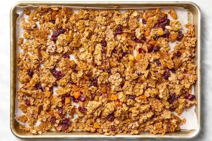 Place the baking sheet on a wire rack and sprinkle on raisins or other dried, chopped fruit. If you want clumps of granola, press and tamp down the granola before it cools, which will help it stick together. Cool completely before storing.