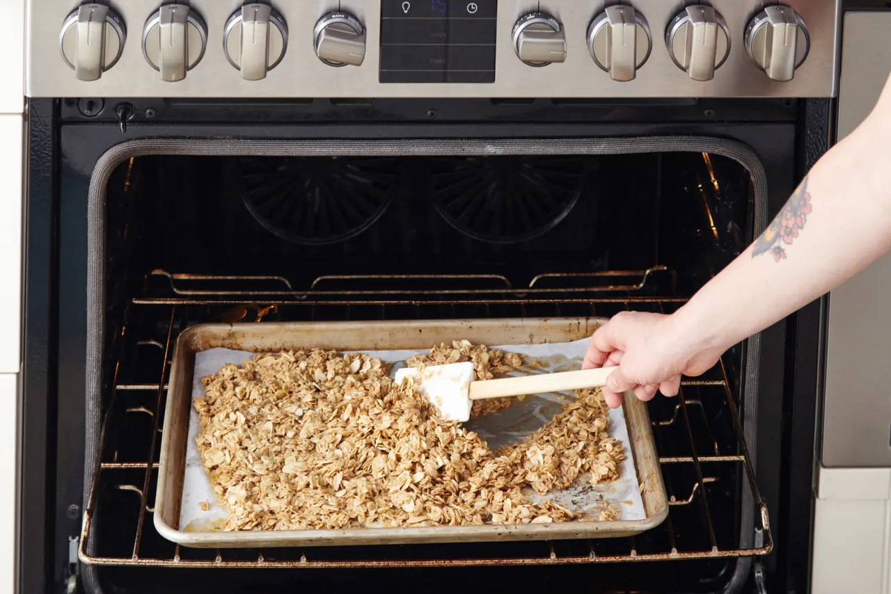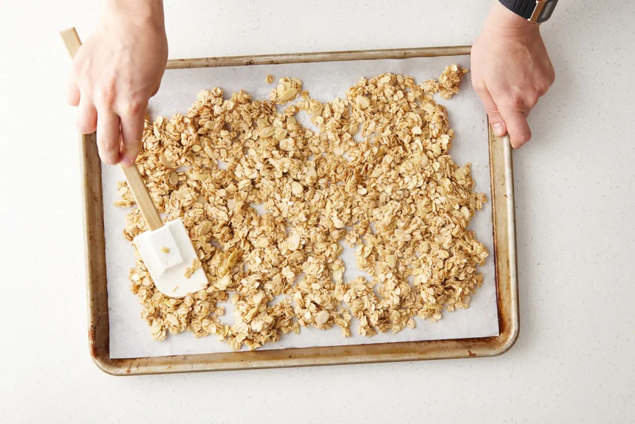 Transfer the mixture to the prepared baking sheet and spread into an even layer. If the granola is clumpy, use a spatula to press it into the pan.